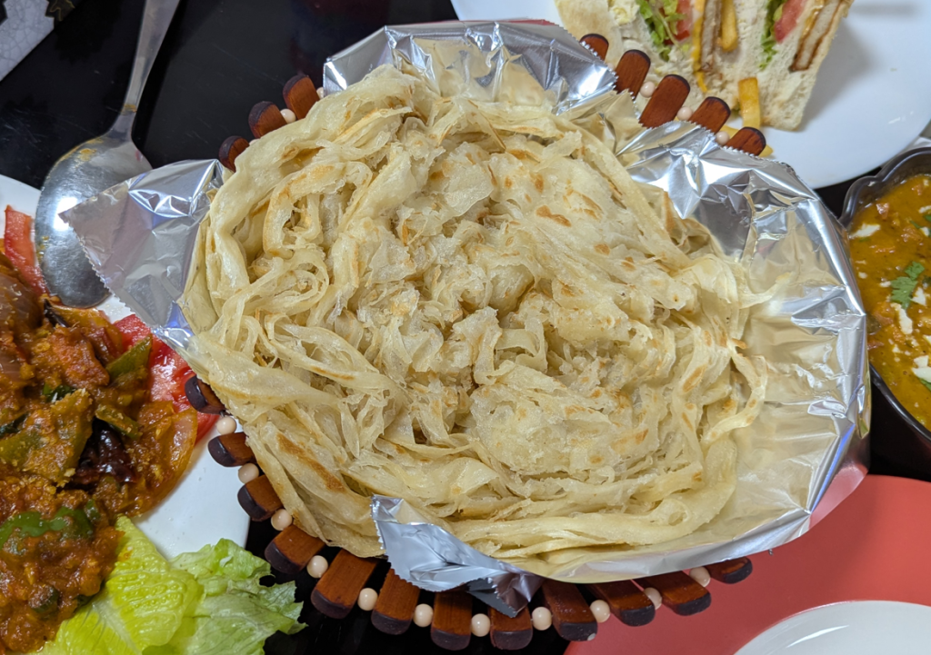Ale parotta … to je placka, která je smotaná z velmi tenkýho těsta. Tradičním postupem při výrobě je dosaženo toho, že tato parotta má hodně vrstef, který jsou vzájemně oddělený malým množstvím tuku.